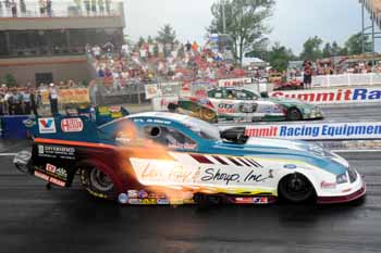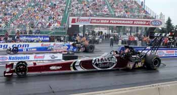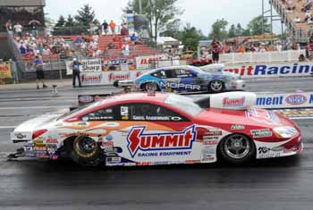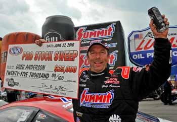 "This is beyond a dream weekend," said Anderson, who also swept both races in 2004. "I couldn't have even have dreamed anything this big before we came here this week. I just hoped and prayed that we came here with a good performance and functioned properly throughout the weekend and just had a slight chance of sneaking a few round-wins and maybe a lucky victory away, and we ended up sweeping the weekend and taking every doggone nickel they had to give. It's been a long time since we've had a weekend like this. I guess I've got to go back three or four years when we had a car that could do these things." Anderson outran Johnny Gray, Jeg Coughlin and Jason Line to advance to his first final since the 50th Winternationals at Pomona in February. He was happy to take his first win of the season in front of his sponsor Summit Racing Equipment, who also sponsors the event and the track.