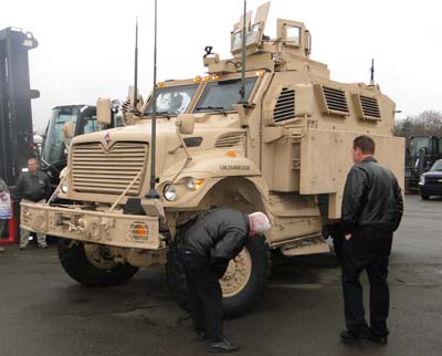Our next stop was a real treat, as we were taken into the parking lot and shown a Mine Resistant Ambush Protection vehicle, more commonly known as the MRAP. Costing a cool 1.5 million, this behemoth is designed to protect our troops from IEDs, which are the leading cause of casualties in the Middle East. It is truly an imposing vehicle, weighing in at just over 53,000 pounds due to the extensive armor it carries. Just opening the 900 pound doors takes an incredible effort. Although we were instructed not to take pictures of the interior or the undersides, they graciously allowed us to climb in and take a look, which was amazing. It seems indestructible, but, most importantly our guide Sgt. Gonzalez, relayed how he had been able to witness its performance in person down range, and assured us it was the real deal. As far as I am concerned, if it keeps our troops safe, it's worth every penny. >From there, we walked across the parking lot to the Special Purpose Vehicle Shop, which handles everything from jetways used at the airport to the de-icers which keep the massive C-17 and C-5 clear during inclement weather. Sgt. Hesler took us through their biggest de-icer, which is used primarily on the C-5. It carries an on-board 3.4 million BTU heating system, which heats the ethylene glycol mixture they use. It is then pumped through an intricate plumbing system to the boom-mounted cab, which is capable of rising over 76 ft. in the air. Once in position, it is able to deliver the de-icing fluid at a staggering speed of over 700 mph. Naturally, these units require extensive maintenance, which is where Sgt. Hesler and his unit come in. After a quick lunch, we headed back over to the BX/PX at the Kaiserslautern Military Community Center for our second autograph session, where we handed out goody bags and signed hero cards for the families who were out shopping. While doing so, I was approached by this young lady named Molly, who mentioned that she was from Minnesota and that she believed we were cousins. We talked for some time, and I believe she might be right.