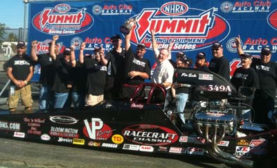 Each of NHRA's seven divisions was then represented in Pomona, as each division champion was invited to compete in the runoff for the Summit Super Pro crown and the title of National Champion. As it would be for most sportsman competitors, just getting to the event was an obstacle for Rader. "Yea, the logistics were a little intimidating," admitted Rader who primarily competes within hours of his Martinsville home. "I took the week off work, and we set out Saturday morning, a week before the race. I had a group of buddies come with me, and we just drove straight through. I figured we wouldn't get out that direction until sometime Monday, but we made it to the track Sunday afternoon with no problems. That gave us all some time to relax and do a little sight seeing. It was really a lot of fun." Another obstacle standing in Rader's way was his lack of recent quarter mile racing experience. As a Division 3 competitor in Southern Indiana, the vast majority of Rader's racing has been done on an 1/8th mile course. In fact, Rader hadn't made a quarter mile pass of any sort in over two years, and never in his current dragster! In preparation for his trip to the west coast, Rader made a pair of quarter mile test runs at O'Reilly Raceway Park in Indianapolis to ensure that his combination and tune-up was compatible with the longer course. Once he hit the track in Pomona, Rader and his machine were operating at full potential, as he made quick work of the all-star field. Rader opened eliminations with a perfect .000 reaction time alongside Division 7 representative Joe Brown, and ran a 7.658 on his 7.62 dial-in to get the round one victory. Then, in round two he dispensed Shawn Herbst, the Division 6 Champion in a breakout decision. Herbst held a slight edge on the starting line, .006 to .018, but broke out by .007 (8.993 on his 9.00 dial) to give a braking Rader the victory with a 7.661 on his 7.62 target.