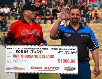 In the first round elimination (Saturday, December 4), Judd (6.115/241.93) lost to Perth racer, Daniel Gregorini (6.140/236.84) after Gregorini employed what many onlookers described as questionable tactics on the start line. Despite running a slower time, Gregorini won on a holeshot, having the quicker reaction time. "It was a terrible run all-round. After a slow start I was behind, but hauling in Gregorini. I felt a bit of tire shake and pedaled to gain traction, but lost a little more time doing so. I was gaining on him again when his car moved over towards me, nearly crossing the centre line. "I was momentarily distracted and accidentally hung on to second (gear) a little too long. After I hit top (gear) I was starting to overtake him again, but just ran out of track." After the race, Judd was critical of the highly controversial ANDRA rule that allows 20 seconds for the last racer to move from pre-stage to full-stage. In the USA, Pro Racers (Group One) are allowed seven seconds. "In pre-stage, racers push their vehicles up to a high rpm to maximize acceleration at launch. This heats up the clutch quickly and puts strain on the motor, so minimizing the time in full-stage at high rpm is critical. Despite the ANDRA rule (brought about mostly by non-supercharged Group Two racers lobbying ANDRA) being in place, there is an understanding amongst Group One racers that they do not deliberately hold the other racer in full-stage at high rpm for any longer than is necessary," Judd said. "I was dirty for allowing myself to be put in a position where I could be hung out on the start line. It is a technically legal tactic, not practiced in Group One because these (supercharged Doorslammer) cars cannot be held for 20 seconds at five or six thousand rpm without hurting something. I won't let that happen again." Judd's first round loss meant he missed an opportunity to capitalize on his championship points lead. "I should have done better, but now I have to fight to regain the championship points lead," Judd said. Belleri (6.009/230.09) beat Gregorini (6.422/233.76) in the semi final. Belleri (6.109/235.60) then went on to defeat Zappia (6.299/221.67) in the final. With Perth championship events carrying 50 percent bonus points, Judd picked-up the maximum 15 points for top Elapsed Time and Speed and 12 points for top qualifying. In the championship series race, Judd is in second place with 200 points, behind Belleri (227pts) and ahead of Fabietti (186pts) and Zappia (151pts).
