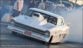 "I've always loved fast doorslammers," said the driver of the 1967 Chevy II Top Sportsman entry. "I was trying to find the right time to get into this type of racing, but the Quick 32 Sportsman Series opened the door." After racing for about 20 years, Corriveau toyed with a dragster to race in the series, but the opportunity came along to purchase the ex-Bruce Boland Pro Modified, and he set out to make the car a top runner in the Quick 32 Sportsman Series. Running a DSE1-built big-block Chevy engine, Corriveau won the Top Sportsman side during the series' opener at the Cayuga Dragway of Toronto Motorsports Park in May of 2010, and knew he had made the right decision. "We weren't sure how this was all going to turn out, but it's been okay so far," he noted. "I knew the car I got from Boland had been a successful car, and I'm glad I stepped up to the class." Corriveau has bolstered his effort with a 615-cubic inch, nitrous-fueled engine from the shops of DSE1, and a two-speed Powerglide sits behind the engine between the rails of the TT Fabricating car chassis.