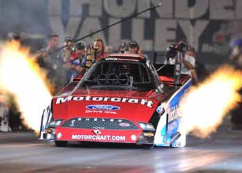 In Funny Car, Tasca powered his Motorcraft/Quick Lane Ford Shelby Mustang to a run of 4.107 at 308.21 mph to qualify in front of fellow Mustang driver Robert Hight, who posted a 4.110 at 301.33 in his Auto Club Ford. Local favorite Matt Hagan was third with a 4.112 at 303.50 in his DieHard Dodge Charger. “With night racing, as a driver finding the groove is important,” said Tasca, whose only No. 1 qualifying effort came in 2009 at Gainesville, Fla. “I got out there and it started really moving around. I had my hands full and finally hit the chutes. I didn't think a 4.10 would hold. We're real happy with it. It was a better run than we gave it credit for. I'll tell you, sitting in that car when you hit the throttle at night, you see an orange amber glow, then as the header flames start to lay back the orange disappears. There is nothing like it.”