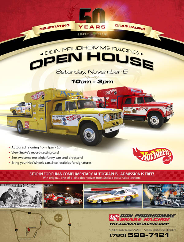 As NHRA celebrates its 60th anniversary there have been a lot of very special events taking place and one of the best will occur this weekend. For the first time in almost a decade, drag race legend Don "The Snake" Prudhomme will open up his shop to the general public. This is a great opportunity for fans to stop by and see one of the great drag racing car collections of all time. Featuring most of Don's history making cars, the collection includes dragsters and Funny Cars along with classic cars and other pieces of drag racing history and memorabilia. One of the highlights of the event will be the display of the two car carriers that were used by Don and his Hot Wheels rival, Tom "The Mongoose" McEwen as they toured the country. Recently restored, these two rigs are as much a part of the history of "The Snake" as any of his race cars and they have been the center of attention everywhere they go. In addition to the display there will be tours of Don's shop, special autograph sessions and surprise guests who will drop by throughout the day. Admission is FREE and there will be door prizes and other surprises for those who stop by. Take advantage of this unique opportunity to visit Don's shop, meet the legendary "Snake" and see some of the cars that were part of the 60 years of drag racing history. The open house takes place this Saturday, November 5th between 10 A.M. and 3 P.M. For more information or directions call 760-598-7121