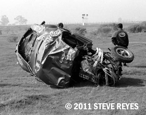 Two of the best in 1966 clashed at Irwindale, California. The Herrera and Sons Austin vs. the Kohler Brothers Anglia. A couple of months later and Herrera's Austin was destroyed in a strange crash at Lions. While racing at Lions, Herrera did a huge wheel stand. Upon returning to mother earth, the Austin crushed its front end resulting in the Austin having no steering so it made a left turn behind its opponent. Oh yeah, the throttle was also stuck wide open. At Lions on the left side about 90 feet out there was an opening for the ambulance to drive on to the track. Yes, you guessed it, the wayward Austin found the opening and smacked into the ambulance. Driver Manuel Herrera was shook up but not injured. The ambulance crew was very surprised, but uninjured. It was just another night at Lions.