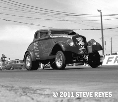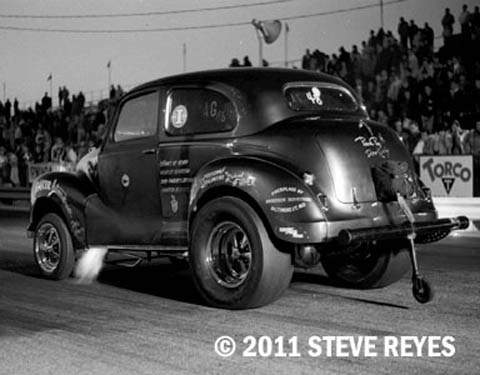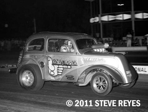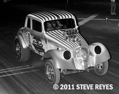 The supercharged Anglias and Austins were also loud, cool and ill-handling. Of course these racers would do battle all over the USA. From coast to coast these "Pre -War" funny cars would attract a cult following of drag racing fans. The rivalry of this class was wild. It seemed like weekly ads in Drag News would heighten these rivalries with Isky Cam Ads taunting Big John Mazmanian's exploits of his candy red Willy's. The following week Engle Cams would brag about Stone, Woods and Cook's adventures down the quarter mile. The rock stars of this class were "Ohio George," Stone, Woods and Cook, Big John Mazmanian, KS Pittman, JR. Thompson, Kohler Brothers and Shores and Hess. In the Northwest, Jack Coonrad and Twig Zeigler raced their Willy's. The East Coast was the home of the S and S Automotive group of Gassers. The Willy's and Anglia bodied racers started to give way to other body styles and classes. Ohio George would trade his 33 Willy's for a Mustang bodied gasser. Stone, Woods and Cook would forgo the Gasser class and go funny car racing. Big John and Jr. Thompson would combine forces and race an Opal bodied gasser before both would go funny car racing. New York's Jim Oddy would switch from Austin to Opal bodies. The Hill Brothers would go funny car racing, Prock and Howell's beautiful '33 Willy's was parked and a Mustang nitro burning funny car was debuted in 1970. All of a sudden a fleet of super charged Opal gassers flooded the quarter mile from West coast to East Coast. The old style gas coupe was dead, the victim of progress. But folks like Phil and Dee Morris who publish the Gasser Wars Magazine will never let the old style gasser die. Their all color self-published magazine features restored, original and the best of the Willy's, Austin, and Anglia's from all over the USA. It also includes coverage from reunions and nostalgia races. It is truly the gasser fans bible. For me the supercharged and non-supercharged gas classes in drag racing were a special part of the sports history and I am glad I got to experience it. Below is a photographic glimpse into this special part of history. If you wish to purchase any of the photos below, please contact us at blrenterprise@cox.net or you can find other photos at www.reyesontour.com.
