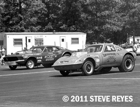 Two giants in the AA/GS class meet at Englishtown, New Jersey 1971. Ohio George Montgomery and his Turbo Mustang vs KS Pittman and his Tiger Opal. It was strange to see these two icons of the gas classes driving modern bodied race cars. Gone were the '33 Willy's bodied gassers that both were known to have raced.