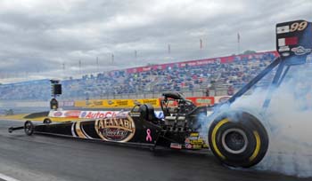"We're all glad as a team to be back here and back in this hunt," said Hagan. "We were looking to get another qualifying run in tonight; unfortunately the weather didn't allow that. We have to go forward tomorrow and hopefully make some laps and have a long day. I believe in our team and the guys that got us here, and I believe that (crew chief) Tommy DeLago is going to carry us through this thing. I just have to stand on the pedal and have some fun." Cruz Pedregon, who entered the event third in the Funny Car standings, qualified fifth for the event and moved to within 35 points of Hagan, while fourth-place driver Mike Neff qualified third for the race and sits 40 points behind the leader.