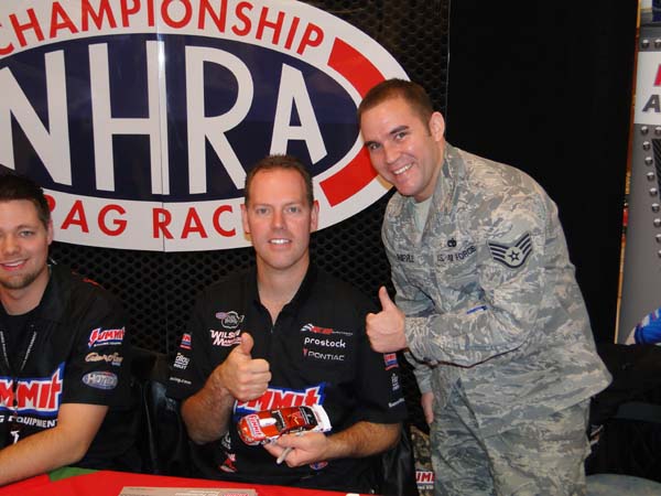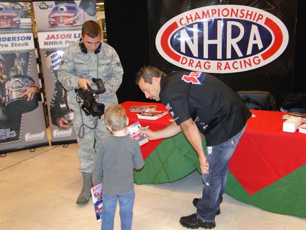 Today, Rickie Jones, driver of the Summit Racing Chevy Camaro Pro Nitrous Pro Mod, wraps up Team Summit's visit with a look at the final day's activities: This is my second year taking part in the Summit Racing troop visit to Ramstein AB, and once again it has proven to be quite an experience. Even though I was a little more prepared after being here last year, I continued to be amazed by the tremendous people we come in contact with during our visits, and thank Jim Greenleaf and everyone at Summit for allowing me to be a part of this. Of course, it also doesn't hurt when you're making the trip with Jason Line, Greg Anderson and Dan Runte - they've made it fun. Our day started with a quick trip to the 86th Services Squadron Auto Skills Center, which is commonly referred to as the hobby shop. On the outside it looks like your standard repair shop, complete with bays and lifts. However, instead of being staffed with technicians wrenching on cars, individuals on the base can bring their cars and rent the stalls to perform their own repairs or modifications, using the tools and lifts on hand, with the added benefit of having an on-site parts department and someone to ask for advice. After being welcomed by Colonel Alcott, we spent some time talking to the staff and some of the customers who stopped by, signing autographs and giving out goody bags. One of the more interesting visitors was Jason's cousin Molly Anderson, who he met during our visit one year ago. She had heard we would be at the base and wanted to make sure and stop by to say hello. During the course of the conversation, it came up that she shared the Line family trait of a heavy accelerator foot, and wanted to proudly show him "Rory", her Mazda RX-8. Once Greg and Jason went out to see the car, she also tried to see if they would be interested in going on a ride on the Autobahn, which they unfortunately had to turn down, as we needed to head to our next appearance. >From the hobby shop, we took the 25-minute drive to the Sembach base to visit the 21st Operational Weather Squadron, where we were greeted by Lt. Colonel Wall, who gave us a very thorough introduction to his squadron before taking us into the bustling operations center. This center is one of only seven of its type in the world, covering quite a bit of territory, including the Eastern seaboard and Europe among others, with the primary responsibility for tracking and forecasting the weather, not only in support of any military activity or important flights, but also to provide as accurate a picture of conditions for anyone who might need it. In addition, this facility serves as a training center as they instruct the next generation of forecasters. The first thing that strikes you when walking into the operations center is just how young the staff is (even younger than I am!), something confirmed by Lt. Col. Wall. Apparently, most of them are first-year airmen, each of which has gone through a rigorous eight-month training schedule including courses in physics and thermo dynamics before they can even get close to the floor. However, standing there watching them work, you could see just how good they are. This particular stop was right up my alley, as I have always been fascinated by weather. Living in Illinois, we see our share of severe weather, and I have always felt that if I had not become a racer, I probably would have become some sort of storm chaser, so to be able to see how these airmen did their jobs was fascinating. It was great to have a chance to talk to them about their work, and we ended up spending a good amount of time there before heading out for lunch, stopping at a small restaurant named Big Emma's, which is known in the area for their huge serving sizes, a report that proved to be quite accurate. Jason also got a kick out of it because his daughter is named Emma. >From lunch, we headed over to the Kaiserslautern Military Community Center, better known as the KMCC, which is a mall attached to our hotel on the base which looks a lot like one you would find back in the States. However, in this case, only members of the military and their families are able to shop there. We were set-up in the entrance to one of the primary stores, where we spent the next few hours signing autographs and handing out goody bags to the kids and their parents as they came in. At the same time, we were also interviewed by the Armed Forces Radio Network, talking about ourselves, our trip and the reason we were there. As an added bonus, AFN also had a video crew, and we were each able to tape a holiday greeting that they will be playing on the base throughout the months to come, which ended up being a fitting end to our 2011 trip. We'll be heading to the Frankfurt airport early tomorrow morning to head home, with the six of us taking various flights throughout the morning and early afternoon. Although it's been a fun week, and I'm glad we made the trip, I have to admit I am ready to get home. In the meantime, I would like to once again thank the members of our military for everything they do, and hope we were able to put a smile on your faces over the last few days, just as you did for us. I would also like to wish everyone a very Happy Thanksgiving, and the very best of holiday seasons.