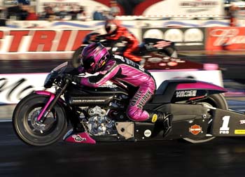 EDDIE KRAWIEC: Yeah, it sure was. I appreciate it, and I had the emotion there on the Saturday one, but man, the Englishtown win for me, it's unbelievable. Q. Harley-Davidson, there isn't a brand that's more synonymous with the United States of America than that one. The Japanese brands are fine and there's a lot of inroads in the market with those, but to do this on the back of a Harley has got to mean a lot to you. EDDIE KRAWIEC: Yeah, it sure does. Even one step further, we had Willie G at the race with us, and to go out there and, number one, wrap up the championship and, number two, win the event with Willie G standing there on the starting line is something special. He is an American icon as well as the Harley Davidson branding, and to be associated with that on an awesome weekend being veterans' weekend and all the stuff that was going on really just electrifies it that much more. Harley Davidson is an icon. They're, as you say, synonymous with the U.S. branding, and not just U.S. branding but world branding. Everybody knows it. And to be associated with those guys and have my name in the record books and etched in there and part of the Harley Davidson racing history is just something that's unbelievable. Q. Eddie, I'm wondering what was the conversation between you and Matt Hines when you failed to win that 10th race and tie his record? EDDIE KRAWIEC: You know, I wanted to beat it. I wanted to tie him and I wanted to get there with him. Matt has done an awesome job, and as a crew chief this year, he made me step up to a level that I feel I should be at. And reason being is Matt is prepared and gave me an awesome prepared motorcycle all year long, could win almost pretty much any race. He wants us to win. That's his job is to make sure he supplies us with great motorcycles. You know, he struggled a little bit as well as I did this past weekend. It doesn't look like we struggled, made it to the final, ran well, but Andrew's bike hasn't been running as well as mine has, so we made a lot of changes to Drew's and paid some attention to that just to make sure we could get all the kinks worked out of it. And with that being said, we struggled with getting mine off the starting line. We really couldn't figure out the key. I put a new tire on the bike this weekend, and I raced pretty much the whole entire middle half of the year and end of the year on one tire. So when we changed the tire, it sort of threw our clutch setup and our chassis setup off a little bit. We were just struggling to find it. We were going some 1.06 and Andrew was going 1.04 60-foot, so the ET gain that Andrew had was all made up in the first 300 feet of track. If I could have got mine right in its sweet spot like Andrew's I think it would have really gave me a good chance. But I'm very happy with the way my season went. To record nine final rounds and win them in a total out of 11 is definitely something special. I think it was the most out of any pro category. I guess I have no room to complain.
