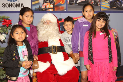 The raceway hosted more than 230 Sonoma Valley children and their families at the event, which featured caroling, refreshments, a car display, balloon animals and a visit from Santa Claus, who arrived via special transportation on a Schell-Vista Fire Department fire truck. The event, which has attracted more than 1,800 children since its inception in 2005, culminated with Santa Claus presenting each child with a bag full of toys. Children ranged in age from newborn to 12-years-old. "I had so much fun today," said Sonoma's Angeles Qunitero, six years old. "My favorite part was getting a gift, getting a stuffed animal and seeing Santa." The festive event was held under cloudy skies, but all of the children left the raceway with new toys and wide smiles. Following the toy distribution, everyone was treated to a free lunch at the Raceway Caf?. "This is a great opportunity for these families, some of whom cannot afford gifts this year," said Maria Calvillo, receptionist and client resource assistant at La Luz Center in Sonoma. "It's been a really tough year for some of them, so this means a lot." All children who attended the party were pre-registered through six Sonoma Valley youth groups, including: Friends in Sonoma Helping; La Luz Center; Sonoma Valley High School Teen Parent Program; Valley of the Moon Boys and Girls Club; Sonoma Valley Mentoring Alliance; and the WillMar Family Grief and Healing Center. The raceway received a generous outpouring of support from the community as more than 700 toys were donated for the party. Some of the drop-off locations included: Sonoma Valley Index Tribune; Sonoma Valley Sun; Gundlach-Bundschu Winery; Schell-Vista Fire Department; Sonoma Valley Chamber of Commerce; the Sonoma Valley Fire Department; and Redwood Credit Union. The raceway also received toy donations from United Site Services and the Sonoma Valley Mother's Club, as well as toothbrushes and toothpaste for each child from the American Red Cross.