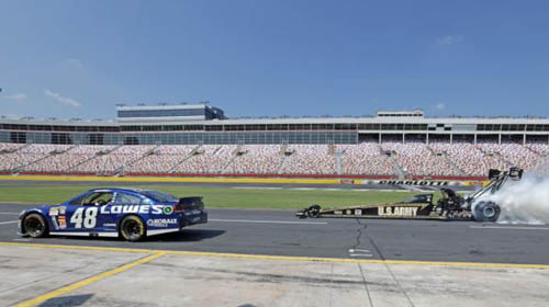 Inside his No. 48 Lowe's Home Improvement Chevrolet, Johnson was awestruck by the sound and violence of the Top Fuel dragster. Seeded second in the NASCAR Chase for the Sprint Cup, Johnson will vie for his sixth NASCAR Sprint Cup Series championship beginning this weekend in Chicago. "I'm not going to lie, I'm sitting there in my car getting ready to grab second gear and try to create a little more smoke and that thing goes thundering by," said Johnson. "I had no clue what was happening. I thought a bomb went off next to me. That is incredible. It's been a lot of years since I've seen nitro. I was pretty young, probably seven or eight years old, the last time I was at a drag race. To see 10,000 horsepower next to you, tires smoking. That is impressive." Schumacher powered his U.S. Army-sponsored Don Schumacher Racing Top Fuel dragster for the burnout prior to the first race of the NHRA Countdown to the Championship across the street at zMAX Dragway. "You get out here and hear two cars; two champs are standing there and you go that's what I'm doing," said Schumacher. "I know exactly why I showed up to do this. It's a great racetrack. To get to run a burnout next to another champion, he's won five championships he knows how to do it." Johnson, whose appearance was part of the NASCAR Chase Across America program to kick off the Chase for the NASCAR Sprint Cup, will return to Charlotte Motor Speedway Oct. 12 for the only Saturday night race in the Chase, the Bank of America 500. "The Chase is going to be great for us," said Johnson. "We have great racetracks in the Chase. We're able to hold that each and every year. The end of August is always tough for us. Those aren't our best tracks. We tried hard this year to make sure they were good tracks for us, but it didn't play out that way. I really feel good with the tracks that are on the Chase schedule, especially coming back to Charlotte Motor Speedway. This has been one of our best tracks." The Bank of America 500 is part of three days of exciting on-track action beginning with Bojangles' Pole Night on Thursday, Oct. 10, the NASCAR Nationwide Series Dollar General 300 on Friday, Oct. 11, and culminating with the Bank of America 500 on Saturday, Oct. 12. This weekend, the NHRA kicks off the Countdown to the Championship at zMAX Dragway with the Carlyle Tools NHRA Carolina Nationals. Tickets start at $25 for Friday and $45 for Saturday and Sunday. Children 13 and younger will receive free general admission with a paid adult all weekend. Carlyle Tools NHRA Carolina Nationals qualifying opens on Friday, Sept. 13, with pro sessions scheduled to begin at 4:15 p.m. and 6:45 p.m. The final two qualifying sessions are scheduled for Saturday, Sept. 14, at 12:15 p.m. and 2:30 p.m. Final eliminations are scheduled for 11 a.m. on Sunday, Sept. 15. The race will be televised on ESPN2 HD with qualifying coverage on Saturday and three hours of eliminations coverage on Sunday beginning at 8:30 p.m. (ET). To purchase tickets, call the Charlotte Motor Speedway ticket office at 1-800-455-FANS (3267) or visit www.charlottemotorspeedway.com. To stay up to date with everything going on at the Bellagio of drag strips, log on to www.charlottemotorspeedway.com or connect with zMAX Dragway on Twitter at www.twitter.com/zmaxdragway or on Facebook at www.facebook.com/zmaxdragway.