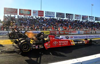 The runner-up finish put the still-winless Beckman in third place in the standings, 44 back of Hagan. Robert Hight is fourth overall, 48 points back in his Auto Club Mustang. Two-time champ Pedregon dropped to fifth, 83 behind Hagan. In Top Fuel, Brown claimed his third victory of the season and 40th of his career by defeating Khalid alBalooshi in the final round. Brown covered the distance in 3.788 at 323.97 in his Toyota/Matco Tools dragster to take his second consecutive win at this track, and third overall. Runner-up alBalooshi finished in 3.833 at 319.98 in his Al-Anabi Racing dragster. Brown defeated Billy Torrence, Clay Millican and seven-time champ Tony Schumacher to advance to the final round. The effort ended a mini-slump for the defending world champion, who has not been in a final round since he won in Atlanta in early May. Since then he's posted eight first round losses and a DNQ at the Countdown playoff opener in Charlotte.