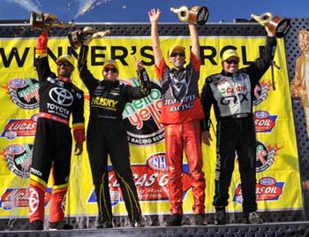 Enders-Stevens, who missed six of the last eight races in the regular season due to lack of sponsorship, moves into fourth place in the points order with the victory, 60 back of Edwards, who regained the series lead. Jeg Coughlin is second overall, and Jason Line is third. "This helped validate the faith that [new sponsor] Husky Liners had in me," Enders-Stevens said. "They are pleased with what we've done, and that's big because this deal only came together four days before the first [Countdown race] in Charlotte. Now we're up to fourth in points, and I think we're three rounds out of the lead, and we're going to do our best to keep winning. This was a make-or-break weekend because if we had exited first or second round, the championship would have been out of reach. Now, the way we see it, this is our championship, and they're going to have to take it from us." In Pro Stock Motorcycle, Smith rode to his second victory of the season and moved into the series lead by outrunning LE Tonglet in the final round. Smith scored his 15th win of his career and second at this track with a performance of 6.887 at 194.52 on his Viper Motorcycle Company Buell, while Tonglet trailed with a 6.950 at 192.14 on his Nitro Fish Suzuki.