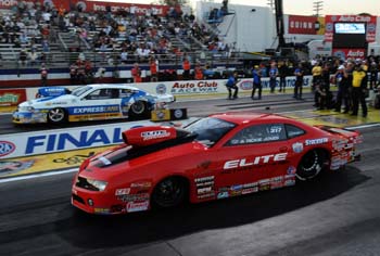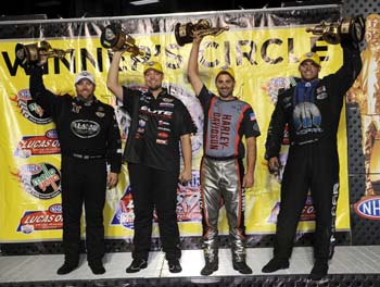 Funny Car -- Matt Hagan, Dodge Charger, 4.018, 320.66 def. John Force, Ford Mustang, 4.057, 317.94. Pro Stock -- Rickie Jones, Chevy Camaro, 6.584, 210.28 def. Allen Johnson, Dodge Avenger, 6.581, 211.03. Pro Stock Motorcycle -- Eddie Krawiec, Harley-Davidson, 6.918, 192.41 def. Scotty Pollacheck, Buell, 6.963, 193.57. Top Alcohol Dragster -- Johnny Ahten, 5.428, 259.86 def. Jim Whiteley, 8.590, 95.50. Top Alcohol Funny Car -- Frank Manzo, Chevy Monte Carlo, 5.531, 265.06 def. Clint Thompson, Monte Carlo, 6.758, 161.59. Competition Eliminator -- Jeff Lane, Chevy Cobalt, 9.863, 95.50 def. Doug Lambeck, Pontiac Sunfire, foul. Super Stock -- Jeff Adkinson, Chevy Cobalt, 8.722, 153.74 def. Don Keen, Ford Mustang, foul. Stock Eliminator -- Bo Butner, Ford Mustang, 9.951, 133.65 def. Peter Biondo, Chevy Camaro, 10.393, 124.37. Super Comp -- Bobby Dye Jr., Dragster, 8.915, 169.06 def. Andrew Madrid, Dragster, 8.938, 166.15. Super Gas -- Pete Zak, '27-T Ford, 9.881, 147.29 def. Dave Kelly, Pontiac Firebird, 9.877, 153.00. Summit Super Pro -- Edmond Richardson, American, 7.269, 170.82 def. Mark Simons, Yancer, 7.566, 178.99. Summit Pro -- Alvie Merrill, Chevy Camaro, 10.231, 129.47 def. Kip Norup, Ford Thunderbird, 9.892, 137.37. Summit Bike -- Chad Isley, Suzuki GSXR, 8.842, 148.36 def. Jon Haney, Honda, 9.688, 137.25. Summit Sportsman -- Jeff Hefler, Chevy Impala, 12.233, 105.36 def. Gary Hairfield, Chevy Corvette, 12.108, 119.46.