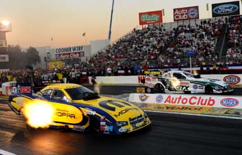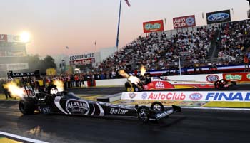 Newly-crowned Top Fuel world champ Langdon finished off his year in style by racing to his seventh victory of the season, holding off hard-charging Doug Kalitta at the finish line in the final round. Langdon powered to a 3.784 second run at 323.58 mph in his Al-Anabi Racing dragster to finish in front of Kalitta's Mac Tools dragster, which posted a 3.808 at 322.04. Langdon defeated Steve Torrence, David Grubnic and Clay Millican in the first three rounds. "This is the top of the cake this weekend," said Langdon, who secured his first Top Fuel crown following Saturday's qualifying. "It's an absolutely special weekend for everybody involved with Al-Anabi Racing. This is what I envisioned as a kid wanting to be a professional drag racer. When you're living a dream and being part of something special, it almost puts you at a loss for words. I'm very fortunate to be a part of a great team. I still have to keep pinching myself." The Southern California native became only the sixth Top Fuel driver to sweep both Pomona races, as he opened the season with a victory at the NHRA Winternationals. Tony Schumacher (2004), Gary Scelzi (2000), Mike Dunn (1999), Darrell Gwynn (1989), and Gary Ormsby (1986) also accomplished the feat.