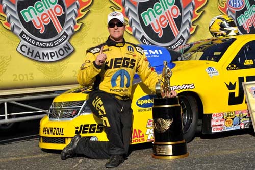 JEG COUGHLIN: Absolutely. We won our first Pro Stock Championship in 2000, had just a dominant season. That's when we were in the traditional format of a 23 or 24 race series and the points accumulated from one end to the other. That was unbelievably special being our first professional world championship and to do it in the fashion we did was amazing. When in comes the Countdown to One effort, we really ignited the whole championship season again and created a playoff for it. It's quite simple, and I think the efforts are certainly paying off for the NHRA and many other major sports in this world. So I think getting back to your question, this last championship is probably as hard or harder to win as any of the other ones, probably more from a mental standpoint because in all but one championship we've won before the final race. In 2007 we won the championship coming into the last race just over two rounds behind. Kind of felt like the underdog. We were swinging for the fences and going for that championship. Don't get me wrong. But almost had that couldn't lose attitude and were able to pull through and win that first year of the playoffs with that effort. This season here we had three or four really good teams that mathematically had a shot at winning the Pro Stock title leaving Sunday night at Las Vegas. Weirder things have happened, and we felt confident that we were going to be qualified and winning rounds and winning the race. But for some reason this one was probably a little more difficult mentally, not just on myself, but on the entire team making sure our Is were dotted, our Ts were crossed, and we got out there and performed as flawless as we could. Fortunately, that's the way it went down. Q. I don't know if you can speak on this, obviously you guys formed that power team with you and Allen and Vincent, and it obviously paid dividends very well for everybody involved. Is that the plan next year to stay with you three? Is that moving forward for 2014? Have you guys made any final plans for that yet? JEG COUGHLIN: I haven't spoken to Allen on a hundred percent of the plan. I know our plan is to continue to run with Allen through the 2014 season and potentially beyond. But I have not spoken with Mr. (Nick) Mitsos or the Nobiles on what their plans are as well. So I'm not up on all the info, as you would say. But I hope so. I enjoy the Mitsos family and the Nobile family and also obviously the Johnson family, and the Ingersols. They're all in this together. So I feel like we've had quite a 1, 2, 3 punch and between the three of us all together we've had a season that no other team had.