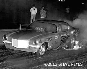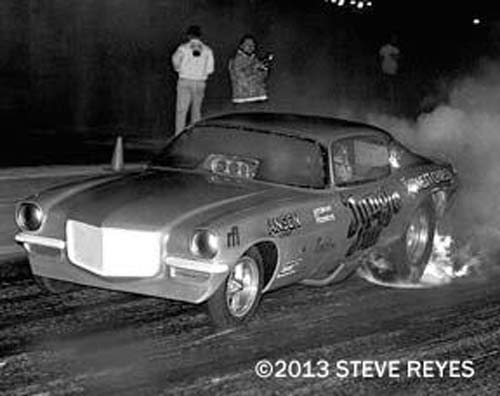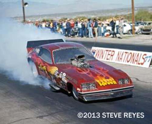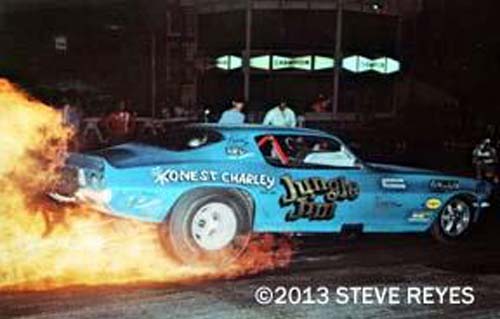 I believe it was 1974 when I last spoke to or saw Jungle Jim. It was at Irwindale Raceway and he was there to race in one of their big funny car events. He had his red Vega funny car there but I didn't see Pam anywhere. That evening Jungle was too screwed up from a hit of acid he had dropped the evening before the race. At the last minute Russell "Doughboy" Long was called by Jungle to drive the Vega for the evening. After that race, the only contact I had with Jungle was a 4 am phone call by a very drug addled Jungle. He couldn't sleep and needed to talk to anyone that would listen. During his rather short funny car career of ten years, he was considered to be the Mr. Showmanship in drag racing. A spectacle in funny car match racing with his 1000 feet burnouts and the scantily clad Jungle Pam backing him up in his tracks as the fans screamed for more. Everyone who met him and saw him has a Jungle story, racers and fans alike. But for me I still remember, the curly headed nineteen year old kid from Pennsylvania who loved drag racing and playing his harmonica. If you wish to purchase prints of the photos below, they may be obtained by contacting us at blrenterprise@cox.net. Other photos may be viewed by following the link at the bottom of the page at www.reyesontour.com.