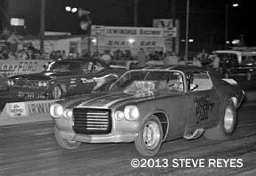 1968 was a banner year for the Jungle Jim gang with his big win at Lions and then a whirlwind tour of the USA. Jim began the year with a two car team and "Jungle" Clare Sanders driving Jim's No. 2 Nova funny car. Clare Sanders in the No. 2 car started 1969 with a big win at the NHRA Winternationals funny car eliminator. This was the first time funny cars had their own NHRA class and Liberman's Nova took home the gold. The blue deuces charged across the USA in 1969 racing almost every other day during the summer months and posting an impressive 86% win record for match racing. At the end of 1969, the Jungle Jim Nova team was on the Car Craft All Star Drag Team and they were the most sought after bookings in drag racing. In 1970, Jungle Jim added yet another car to team Liberman when he purchased Marc Susman's Nova funny car and kept Susman on as its driver. If you wanted Liberman at your race track, the void was now filled with three Jungle Jim Nova's in 1970. Unfortunately, I didn't get to see Jungle much in 1970 as he only had brief appearances on the West Coast in Fremont and Sacramento. Jungle debuted a new Camaro funny car in 1971. The Nova's were history and it was Camaro time. At OCIR and Irwindale I was able to witness and photograph Jungle Jim Liberman's patented funny car fire burnouts. They were incredible, burning and singeing arms and eyebrows all over the starting line and bleach box area. The Jungle Jim show had arrived on the West Coast and the fans loved it. One thing I noticed about Liberman was that he had become brash, arrogant and as always, determined to be the best show in the funny car class. Jungle was now achieving a cult like following because of his wild and crazy antics on and off the race track. Jungle Bobbie was gone and Pennsylvania girl, Pam Hardy had replaced his former wife. Together Pam and Jungle developed one heck of a legend in drag racing. It was sex, drugs and drag racing for Jungle and Pam in the crazy early 1970's funny car racing.