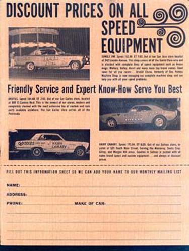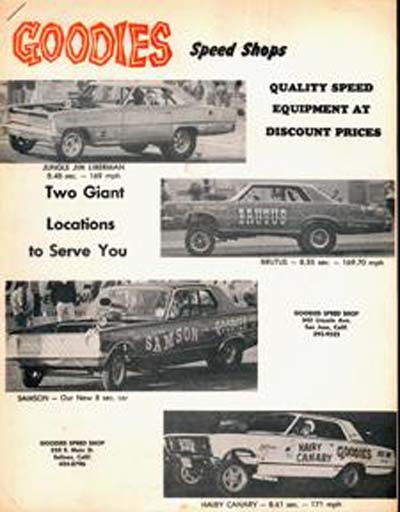 other Northern California race tracks. Richard Guess, owner of Goodie's Speed Shop took good care of his funny car sponsored fleet.