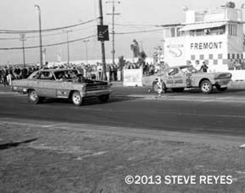 Complete with brown primer and lettering by Bobbie Liberman, the GTO lumbered down the Fremont quarter mile. In 1967 Brutus was modified into more of a funny car, lower and with a blown 392 Hemi. Here Liberman is driving the Arrington owned GTO against Larry Reyes and the Kingfish 'Cuda. Arrington later took over the driving duties of the GTO when Liberman started running his own blown Chevy powered Nova.