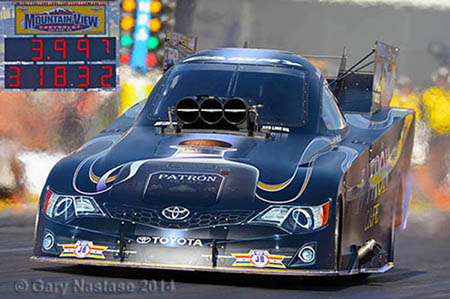 "It's a great accomplishment for our team," DeJoria said in reference to her Patron XO Caf? Toyota Camry's 3.997 second pass. "It feels absolutely amazing to hold that place in history. I have so much confidence in (crew chief) Tommy DeLago and I knew it was just a matter of time. He knows how to run fast." Even more rewarding for DeJoria was who she got to share the run with. Both her husband, Jesse James, and her father, John Paul DeJoria, were at the starting line when she raced to the historic pass. "It's always such a great feeling to run well when you have your friends and family there watching," DeJoria said. "But to have them there during a record-breaking run like that just made the moment all the more special."
