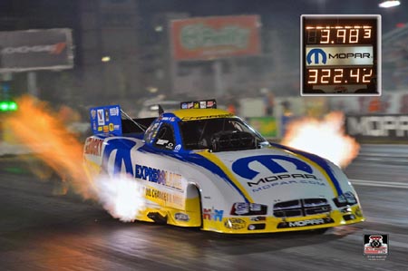 J.R. Todd (Top Fuel), Erica Enders-Stevens (Pro Stock) and Andrew Hines (Pro Stock Motorcycle) also were top qualifiers at the penultimate playoff event in the NHRA Mello Yello Drag Racing Series Countdown to the Championship. Hagan powered his Mopar Express Lane Dodge Charger to a career-best performance and a track record 3.983-second pass at 322.42 mph to claim the top spot, taking away the No. 1 qualifier from his rival John Force, who sits second in points. The run was the first three-second Funny Car pass at The Strip at Las Vegas Motor Speedway. "I'm glad we were able to do the three-second run for the fans out there," said Hagan, who secured his second No. 1 qualifying position of the season and 17th of his career. "They wanted to see a three-second run. Heck when we were coming back, there were a lot John Force fans were cheering for it. Just great for my guys." Force, who announced Peak Antifreeze as a major sponsor for 2015, qualified second with 4.022 at 320.66 in the Castrol GTX High Mileage Ford Mustang. Force, who trails Hagan by 41 points, will race Jon Capps in his elimination opener. Courtney Force, who is third in points, posted a 4.024 at 320.66 in the Traxxas Ford Mustang, good enough for the third starting spot. Force, who reached the finals of both Las Vegas events last season, faces Paul Lee. Ron Capps' NAPA Auto Parts Dodge Charger qualified fourth with a 4.037 at 322.34 and goes up against Tony Pedregon. Jeff Arend drove the Alo Drink Dodge Charger to a fifth place qualifying effort with a 4.042 at 310.91, securing a first round matchup with Robert Hight.