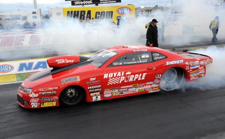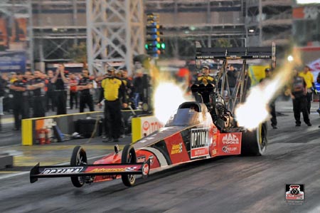 "To me, Las Vegas is not one of the places where I come to expect to set records," Todd said. "The conditions are way different than they were yesterday. I think it's going to be like this tomorrow. I honestly didn't think it would hold up with the two cars behind us." Spencer Massey piloted his Red Fuel powered by Schumacher dragsterto a 3.732 at 327.43, taking the No. 2 qualifier. Massey, who has wins at Atlanta and Topeka this season, takes on Terry McMillen in round one. Doug Kalitta, who sits second in Top Fuel points, put his Mac Tools dragster third with a 3.747 at 317.74, setting up a first round bout with Brittany Force. Richie Crampton, Friday's No. 1 qualifier, was fourth with a 3.748 at 325.14, pitting him against Bob Vandergriff on race day. Points leader Tony Schumacher was fifth quickest with a 3.754 at 329.18. His U.S. Army dragster faces Billy Torrence. Enders-Stevens ran a Pro Stock track record 6.576 at 209.75 to claim her third straight No. 1 qualifying position in the Royal Purple Chevy Camaro. Enders-Stevens, who now has six No. 1 qualifiers this season and 12 in her career, set the track speed run during her first qualifying session of the day at 209.88 mph. With her qualifying effort both days she trimmed series leader Jason Line's advantage from 35 entering the race to 23 points entering eliminations. She will pair up against Jeff Isbell in the first round.