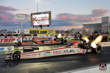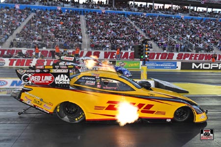 In Top Fuel, Massey claimed his third victory of the season by outrunning J.R. Todd in the final round with a 3.756 at 330.88 in his Red Fuel powered by Schumacher dragster. It was Massey's 17th career victory and third at Las Vegas. With the win, he climbs to second in points, 109 behind series leader Tony Schumacher heading into the season finale. "The car started off running extremely well," Massey said. "We started running a new chassis this weekend and we wanted to see where it would lead us. It showed a lot of promise. For [crew chiefs] Phil Schuler and Todd Okahara and my entire team, we've been working so hard all season long to finally make good solid runs and be consistent on race day." Schumacher came into the NHRA Toyota Nationals with a 136-point lead over Doug Kalitta, but fell in the first round to Billy Torrence. Worsham picked up his first Funny Car win since Richmond 2009 when he drove his Toyota Camry to a performance of 4.064 at 318.39 to take the victory over 16-time world champion John Force. It was Worsham's first win of the season following runner-up finishes at Englishtown and Dallas. He denied Force a chance to climb within one point of series leader Matt Hagan.