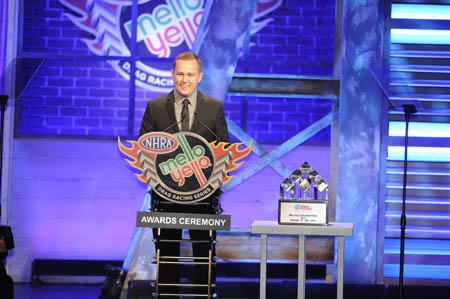 The NHRA Road to the Future Award honors the top-performing rookie in the sport every year. During his inaugural season, Crampton was the No. 1 qualifier at the NHRA Finals and scored wins at the prestigious 60th annual Chevrolet Performance U.S. Nationals in Indianapolis and the 45th annual Toyota NHRA Summernationals in Englishtown, N.J. In addition, his win in Englishtown made him the 100th different winner in Top Fuel class history. "This whole experience is still surreal to me," said Crampton, who also earned a $20,000 bonus. "I've said it before but I am a truly spoiled rookie. To be able to be in the equipment I am in and surrounded by the people I am, it doesn't get any better. I am truly blessed and honored to be in this position." Taking over the reins of the GEICO/Lucas Oil Top Fuel dragster when Morgan Lucas stepped aside to spend more time with his family and take on a more crucial role in the family business, Crampton was free to track the dream that he had always aspired to follow. "Of course, none of this would even be possible if the Lucas family and all those involved had not put their faith in me and given me this chance," Crampton said. "I just want to give a huge thank-you to Forrest, Charlotte, Morgan, and Katie Lucas, who gave me the opportunity of a lifetime. "Also, I want to thank GEICO, Lucas Oil, and Toyota for allowing me to represent them week in and week out on the track. Without any of them and everyone else along the way, I would have never been in the position to follow my dreams." GEICO/Lucas Oil Top Fuel racer Richie Crampton was named the 2014 NHRA Road to the Future Award recipient as the season's top-performing rookie.