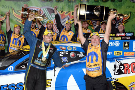 MODERATOR: Matt Hagan and his Mopar Express Lane / Rocky Boots Dodge Charger secured his second Funny Car World Championship with four wins and two runner-up finishes this season. He also powered to two No. 1 qualifying positions. Hagan clinched the championship with his victory over Tommy Johnson, Jr., in the semifinals in Pomona and then went on to defeat John Force in the finals for his fourth win of the year. This is the second Funny Car world championship for crew chief Dickie Venables, as well. Matt, how important or historic was this championship for you compared to your first one? MATT HAGAN: Well, I think they're all special in their own way. You know, like Tony (Schumacher) said in his speech, each one of them tells a story. Someone said earlier when we were having a press conference, they said, you know, well, your second one is harder to get. They're all hard. Every one of them are hard to get. There's not an easy one out there. But they're all very, very special in their own way, and I'm just tickled to death. It finally kind of started to set in. We partied like rock stars for the last three days and finally got back home last night about 1:30 in the morning, and it's just all kind of settling in that we won the world championship. It's my second one of my career, and in such a short amount of time, six years out here driving for Don Schumacher Racing and to be able to have two championship trophies from NHRA and Mello Yello sitting in your living room. Q: Talk about Sunday in Pomona. It was so exciting, at least for the fans on the outside to watch the championship go back and forth, round to round. What was it for you being inside the cockpit on Sunday? MATT HAGAN: Well, you know what, all the way up until that day, I was like, man, just cool, calm, collected, let everything happen. But you're just a nervous wreck. There's no way around it. As a competitor, as someone that has put everything into this, this is what you work all year for. This is what you get up early in the morning, you go work out, you get back on a practice tree, you're talking to a sports psychologist, just everything to have the mental edge to do everything it takes to go out here and win, like I said in our press conference in Vegas. It's just a phenomenal feeling when it all comes together, and all the hard work you put into it all year long, you've got to I guess today is why it's soaking in because I can sit back and reflect on some of the round wins and the race wins and just all the stuff that it took us to get there to be able to win this thing.