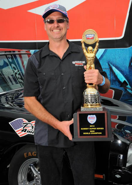 "When we unloaded on Thursday, the car didn't want to run. During our first three passes the car was missing, popping and didn't want to reach a certain RPM. So we took the car back to the pits, pumped the fuel out, flushed the carb, put in new plugs and went back to work. Our next pass we went a dead-on 10.19," Pressey said. "We are thankful we had good weather on Thursday for the test and tune. After that the car was flawless." With the win, Pressey not only gets the title of world champion, but he claims an awesome prize package that includes $10,000 from Summit Racing Equipment, a brand new 26' trailer from Performax Trailers, a $2,500 gift certificate from Trick Flow, a Gemini two-post Auto Lift, nearly $10,000 in prizes from Chicago Wheels, Hughes Transmission and Converter, Armor Coat Ceramic Header Coating, Rock Racing Battery, Jones Transmission and K&N, a vacation to Aruba and more. "We saw a lot of weather, a lot of ups and downs and spent a lot of time just sitting and waiting, but we did it," Pressey said. "Thanks again to all of my friends. I went through some stuff over the past year, but I have some great friends that supported me. What an exciting year and what an amazing program IHRA puts on. It was a great experience for all of us."