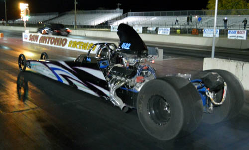 David Bills(San Antonio), driving for Scott Ball in the car his daughter Emily moves into next season, went head to head with Greg Meuth in the finals. Meuth, in his Quality Auto Care, big block Chevy powered TNT Chassis, gave up a tenth on the light and that was all Bills needed to take a hole shot win as both drivers nailed their number on the big end. If my math works out right, the margin of victory comes down to .004(4/1,000th) of a second. David Bills(4.84), 4.844 @ 139.36 defeats Greg Meuth(4.87), 4.870 @ 139.53 Bills, who lost in round 1 to Danny Martinez, made his buy back pay off taking down Chris Keylich, E. League, Jaime Gonzales and former track and national champ, Scott Ball, plus a round 2 bye. Meuth, who red lit to Victor Hinojosa in round 1, then trailed Hinojosa in the rematch, Michael Keylich, Carlos Carrasco sr. and got a semifinal bye.