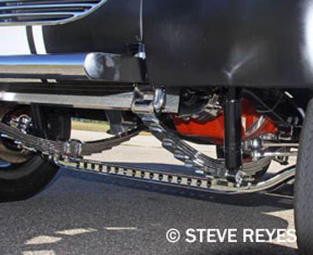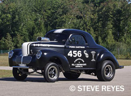 Now a big part of these nostalgic events are restored and recreated cars that were the most popular ever to grace a quarter mile. This is where Larry and Wanda Blanchet fit into our nostalgia based tale. The Blanchet's of Skowhegan, Maine love everything Willys. I first crossed paths with them over fifteen years ago when I ventured to Maine to photograph their pro street Willys. Their Willys was a beautiful candy red creation and I spent almost half a day shooting photos and hangin' with Larry and Wanda at their place in no-where Maine. Now, fast forward to this year's NHRA Gatornationals and I was in the Legends tent next to gas coupe star Barb Hamilton signing autographs with a bunch of Legends of drag racing. As we were finishing up a pretty woman stepped up and asked if I remembered her? This could be an awkward moment for most people but not a photographer with a photographic memory. I responded, "Hello, Wanda, long time, no see." She was floored I had remembered her from fifteen years ago. Anyway, we spoke about their tribute car they now own which is the Charlie Hill/Pork Zartman Filthy Forty C/G Willys coupe. Wanda told me that they found the car in Pennsylvania in December of 2003 through a friend, Bruce Caswell. The car was an all metal C/G car believed to have come out of the Midwest but they were unable to fully trace the history of the car. The car was in really good shape when they found it and the only thing that wasn't original to the car was the 1941 center section which had been replaced with a 1940. The firewall and front floor had been cut out of it and the frame had been modified. So the Blanchet's gutted out the frame, boxed the rails and built new cross members for the car. They installed a 1957 'Olds rear with home-built ladder bars. Then drilled out the front axle and added a disc brake set-up. Next they stuffed a 392 Hemi-blown with Hilborn injectors into the ample engine compartment, after which they installed the body and made a new firewall and floor to fit around the motor and transmission. Then the rear fenders had to be repaired as they had been cut out too large. Now it was time for the paint job, so the Blanchet's took everything apart, smoothed the body and chassis for paint. About this time they saw an article in Gasser Wars Magazine on Charlie Hills Filthy Forty. They loved the look of the white stripe on dark grey primer. However, they did change the grey primer to satin black primer. At this point of the retro gasser project they had become friends with Pork Zartman and the S&S gasser race team. In 2007, the S&S team were asked to be Grand Marshall's of the Gasser Reunion in Thompson, Ohio. The S&S team had all finished their cars so the Blanchet's asked Pork if he would like them to letter the car up so he could use it for the reunion. He was flattered with the offer and took them up on it. The car was a bit hit and Pork had a great time at the event. The car has stayed lettered like that ever since the event in 2007. Pork got to drive the car at the Willys Home Run event in Buffalo, New York but his biggest thrill was driving it at the NHRA US Nationals which was his 45th Anniversary of winning his class in 1963. Pork Zartman got to enjoy his glory days all over with the help of Blanchet's retro Filthy Forty. Pork passed away on March 28, 2010 which was very ironic because it was Larry Blanchet's birthday. The Blanchet's will continue to travel and display their Willys and keep the memory of Charlie Hill and Pork Zartman alive. If you wish to purchase prints of the photos below, they may be obtained by contacting us at breyes@reyesontour.com. Other photos may be viewed by following the link at the bottom of the page at www.reyesontour.com.