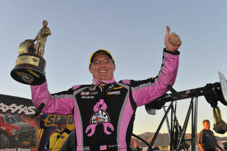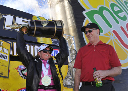 Meanwhile, Enders joined Angelle Sampey as the only women in NHRA history who have successfully defended a world championship title. Sampey won three consecutive Pro Stock Motorcycle crowns from 2000-2002. Enders claimed her fourth consecutive victory at LVMS and 21st career victory by outrunning rookie Bo Butner in the final round. Enders Elite Motorsports Chevy Camaro posted a 6.595 at 208.97 to finish in front of Butner's Speed Dawg Shift Knobs Camaro, which trailed with a 6.610 at 209.33. "My guys are so incredible," said Enders, who earned $250,000 for the championship and another $50,000 for taking the event victory. "It's amazing what you can accomplish when you get the right people around you. To do it in front of all my sponsors and family here this weekend it is incredible. To cap off a second world championship here at Vegas is just crazy."