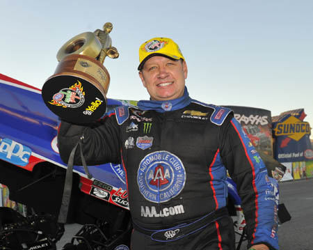 Johnson's strong effort this weekend put him in the championship conversation in Funny Car, albeit 97 points back in third place behind leader Del Worsham and second place Jack Beckman. Worsham and Beckman lost in the second round and Worsham leads by 38 points heading to the season-finale at Pomona. Hines earned his fourth Pro Stock Motorcycle victory of the season and third in the Countdown, powering his Screamin' Eagle Vance & Hines Harley-Davidson past Jerry Savoie's White Alligator Racing Suzuki in a final round with major title implications. With the win, Hines increased his series lead to 46 over the hard-charging Savoie. The championship in the two-wheel class will be decided at the Auto Club NHRA Finals in two weeks.