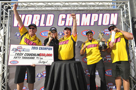 Coughlin took the title in his yellow and pink JEGS.com Corvette after winning his quarterfinal matchup against Sidnei Frigo and his closest challenger, Bob Rahaim, lost in the same round. Mike Janis, who held the points lead coming into the event, was upset in the opening round of eliminations on Saturday evening. Janis finished second in points. Coughlin earned $50,000 for winning the season long title. He also won the championship in 2012. "It seems like it just happened yesterday that we won the first title," Coughlin said. "Boy, what a sweet deal. What can I say about all the guys on this JEGS.com car. It's pretty exciting. To come back and do it again, that doesn't happen very often. As tough as this class has gotten over the last couple years, it makes it that much sweeter, for sure." Former Pro Mod champ Khalid alBalooshi powered his Al-Anabi Racing '69 Camaro to the event victory over Pete Farber. In the final, alBalooshi posted a 6.854 second run at 245.76 mph to finish in front of Farber's '69 Dodge Daytona, which trailed with a 6.942 at 244.43. In earlier rounds he outran Rickie Smith, Steven Whiteley and Rick Snavely. It was alBalooshi's first win of the season and third of his Pro Mod career. Final round-by-round results from the 15th annual NHRA Toyota Nationals at The Strip at Las Vegas Motor Speedway, the race is the final of 10 events in the NHRA Pro Mod Drag Racing Series. ROUND ONE -- Pete Farber, Dodge Daytona, 5.933, 244.12 def. Eric Latino, Chevy Camaro, 5.971, 240.94; Bob Rahaim, Chevy Corvette, 6.001, 217.91 def. Mike Janis, Camaro, 6.860, 142.63; Sidnei Frigo, Corvette, 5.902, 249.72 def. Robert Patrick Jr., Ford Mustang, 6.968, 149.40; Troy Coughlin, Corvette, 5.867, 248.02 def. Danny Rowe, Corvette, 5.964, 241.93; Steven Whiteley, Cadillac CTS-V, 5.861, 245.72 def. Dan Stevenson, Camaro, 5.893, 245.94; Khalid alBalooshi, Camaro, 5.829, 247.16 def. Rickie Smith, Camaro, 5.944, 244.03; Rick Snavely, Camaro, 5.837, 257.09 def. Chip King, Dodge Charger, 5.952, 236.71; Don Walsh, Camaro, 5.876, 216.83 def. Jeff Naiser, Camaro, 6.372, 218.37; QUARTERFINALS -- Farber, 5.891, 245.67 def. Walsh, foul; Coughlin, 5.867, 252.85 def. Frigo, 5.973, 223.10; Snavely, 5.886, 254.14 def. Rahaim, 6.043, 241.50; alBalooshi, 5.833, 246.98 def. S. Whiteley, 5.926, 244.92; SEMIFINALS -- Farber, 5.967, 242.98 def. Coughlin, DQ; alBalooshi, 5.860, 246.35 def. Snavely, 5.911, 247.97; FINAL -- alBalooshi, 5.854, 245.76 def. Farber, 5.942, 244.43.