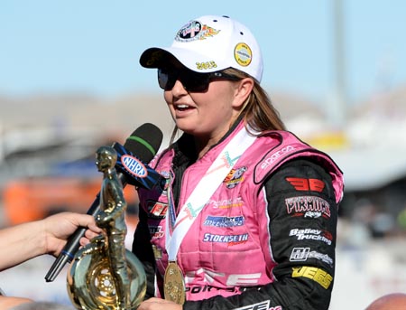 ERICA ENDERS: No. I mean, not really. I've gotten to spend some time with Shirley Muldowney since then. We did an event at SEMA yesterday. She's in my hometown of Houston today, we're having a luncheon together. Pretty cool to have somebody I've looked up to, mentored me, she's been one of my biggest supporters. That's been pretty awesome and surreal. A ton of phone calls, thousands of emails and text messages. I spent the last two days at SEMA at Las Vegas, you can't walk three feet without stopping and talking to somebody. It just shows that our fans are so loyal and they are so supportive of our sport, it's pretty neat. Q. This may be a little in advance, but how much hungrier does this make you to want to add championship number three and four and as many as you possibly can? ERICA ENDERS: I definitely want to strike while the iron's hot. We've got such a great program. It does make me more hungry. I didn't think I could want anything more than I wanted the 2014 championship. But this year when we came out, I made a decision that I was going to play with all the heart that I got. I drove so much better this year than I drove last year. I drove good last year, but this year I drove even better. I really stepped up to the plate, and so did my guys. We struggled so much with the two new rule changes with the fuel and the tire this year. Next year the rule changes are going to be even more intense with going to fuel injection, having a 10, 500 rpm limiter, shorter wheelie bars. The rules are absolutely crazy. Having said that, I feel like I have the smartest and best guys in the business on our side. So I know our off-season is going to be full of a lot of hard work and testing. I feel like we can crawl our way back up to the top, and definitely it's going to make us more hungry to prove that we can do it over and over again.