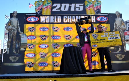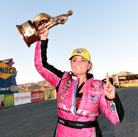 ERICA ENDERS: It's pretty surreal, to be honest. I mean, I spent my entire career trying to get to this point. I've said it a million times before, but I've had way more valleys than I've had peaks. It took me seven years trying to make Pro Stock work in order to get my first win. It just seemed like an eternity. Once that first win happened, I won a handful of races over at Cagnazzi's. My career took a turn for the best when I joined Richard Freeman and Elite Motorsports. It just goes to show with the right people, anything is possible. Money and sponsorship doesn't hurt, horsepower doesn't hurt, but those things don't win races, those things don't win championships. It's been proven over and over again because the most wealthy guys in the sport haven't been able to get it done. We run on a very limited budget and we've been able to do it. It's just the right group of people in the right places. We have great team chemistry. We've gelled so well. We work well together. We trust each other. Most importantly, we have fun. Having that much fun I feel like makes us even more successful on the racetrack. It has been a whirlwind to have been able to win 21 Pro Stock races in three years. It's crazy. I had always hoped, but I never thought it would happen. Just goes to show that God's timing is perfect. MODERATOR: We'll open it up for questions. Q. To win two championships in a row, championships are never identical, what is the most important feeling you get with this championship? ERICA ENDERS: I don't know. That's a tough question because, I mean, being able to accomplish what we did in the fashion that we did it in 2014, I didn't think it could ever be topped. The first is always the best and the most memorable. But having the second and doing it back-to-back is pretty cool because I wanted to prove so badly that it wasn't a fluke and that we do mean business. My guys are just incredible. The most important part of it is being able to enjoy the success with the people I care about the most. Last year, having it go down to the final round at the final race of the year, then this year it was so different because we were able to lock it up in Vegas with one more race to go. So we'll go into Pomona kind of with a little bit of weight off our shoulders. At the same time, I just mentioned, we want to go out to Pomona and win that race as well. My guys are perfectionists and extremely competitive. To be able to do it back-to-back says so much about our team and what we're capable of.