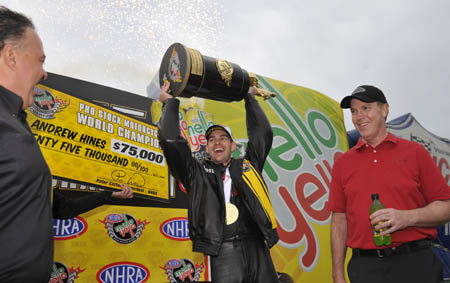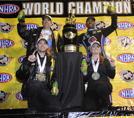 "The cars were running so fast here this weekend that the record just became part of the equation," Worsham said. "(Beckman) was making up points before we even started racing by setting the record. Today it came down to being head to head and I am grateful for the way it worked out." Meanwhile, Andrew Hines claimed his second consecutive and fifth overall world championship title in Pro Stock Motorcycle when his closest rival, Louisiana alligator farmer Jerry Savoie, lost in the second round. Hines, who pocketed $75,000 for the title, is the youngest driver in NHRA history to win five world championships and continues the amazing domination by the Vance & Hines team in the two-wheel category. "My outstanding Harley-Davidson team did a great job of keeping me focused and keeping the pressure off of me," said Hines, who won four races during the season atop his Screamin' Eagle Vance & Hines Harley-Davidson, including three in the Countdown playoffs. "It was awesome that my wife [Tanya] got to give me a kiss right before I ran, and thanks to my teammate for helping to get the job done. I guess we put the fear of Harley into them. Five championships is pretty awesome."