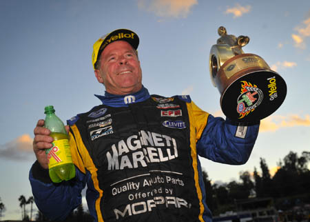 Top Fuel -- Shawn Langdon, 3.715 seconds, 332.43 mph def. Antron Brown, 3.732 seconds, 321.73 mph. Funny Car -- Del Worsham, Toyota Camry, 3.900, 328.14 def. Tommy Johnson Jr., Dodge Charger, 4.023, 305.42. Pro Stock -- Allen Johnson, Dodge Dart, 6.541, 210.18 def. Vincent Nobile, Chevy Camaro, 6.540, 211.93. Pro Stock Motorcycle -- Eddie Krawiec, Harley-Davidson, 6.846, 192.58 def. Matt Smith, Victory, 6.888, 194.21.