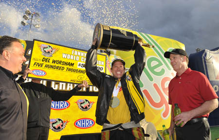 Southern California native Worsham defeated Mello Yello Countdown to the Championship playoff rival Jack Beckman in the semifinals to secure the Funny Car season title at historic Auto Club Raceway at Pomona and become just the third driver in NHRA history, joining Kenny Bernstein and Gary Scelzi, to win world championships in both nitro categories. Worsham won the 2011 Top Fuel world championship. Worsham managed to win the title while Don Schumacher Racing drivers Beckman, Tommy Johnson Jr. and Ron Capps all kept lowering the national elapsed time record throughout the day. Beckman finally claimed the 20-point bonus for the record at 3.884 seconds, but it wasn't enough. "When I put this trophy next to my other one at home it will be real," said Worsham, who earned $500,000 from NHRA and Mello Yello for the championship. "Every time I looked up there was a Schumacher car sitting there in my face. I was nervous about it. I was counting points. I am not going to tell you it was like any other race, because it wasn't. I know the points are the same as the first round at Charlotte, but the circumstances here were much greater."