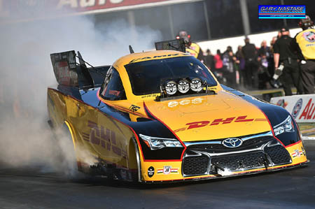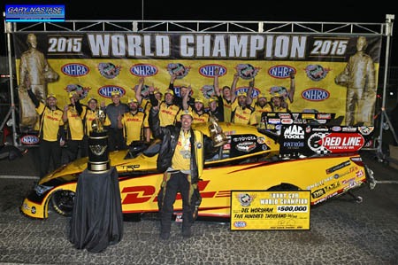 THE MODERATOR: This is Del's second NHRA Mello Yello world championship, but his first in Funny Car. His other was in Top Fuel in 2011. He does join an elite company for drivers to win multiple championships in both nitro classes, and that's Kenny Bernstein and Gary Scelzi. Worsham this year really came alive in the count down playoffs racing to three victories in the first four races, and he clinched his championship which he outran playoff rival Jack Beckman in a semifinal match-up at the season ending finale race in Pomona. He went on to win the race and capture wins in four of the six count-down playoff events. Del, when you came to the media center Sunday night it was such a whirlwind, winning the championship and winning the race. You were obviously very excited but you also seemed a little bit stunned. Have you had a chance to let it all sink in and wash over you now? DEL WORSHAM: No, I haven't, really. We've been on the fast track since that night and, gosh, still quite a few things going on for another seven days, and come next Monday though, it's going to sink in. I'm going to take time off and sit down and really enjoy what took place. THE MODERATOR: Sunday, during the course of the day, during course racing, once again this year, Funny Cars, the 3-second runs, and the national records that we've seen set and even passing hands, back and forth, but how important was it for your team to take your own course and run your own car and not worry about maybe some of the outside influences? DEL WORSHAM: It was very important. We had a small lead going into the event, but that lead can obviously get gobbled up pretty easy with national records and round wins. And, to tell the truth, we were definitely keeping track of points and watching where we were and I knew at all times where we were and what the stakes were, like when Jack Beckman first round, when he went out and won his round and set the record, we had a 36-point lead, well that gave him 40 points, and I knew first round had we not won, he would not have had enough points to overtake us. So it was pressure, it was a lot of tension, but the guys pulled through and we were able to pull it off. Q. Del, congratulations, obviously. And if you could share your best advice to any young person out there about being successful. And, also, what would be your advice to any champion out there that has just one championship? What would be your advice to them on getting that second championship? DEL WORSHAM: Sure, well, thanks, Dwight. I would definitely tell any young kid out there you know, like everybody says, but it's the truth, and that is you have to follow your dreams. I knew at five years old I wanted to be a Funny Car driver, and looking at the path and how I got there. My dad had a local alcohol Funny Car, and he wasn't a driver. He had a partner, and things just kind of transpired where I was actually able to drive the thing just by doing a lot of work and showing a lot of interest, and basically I put my entire life into it, and my dad saw that with his partner and gave me a shot to drive it. As far as winning the second championship, after the first, I probably did it unconventionally because the first championship I won in Top Fuel and ended up quitting that job and taking on a new job. When we agreed to put this thing together for the Funny Car with DHL and Kalitta Motorsports, I took a look at the program and made sure it was something that could be built into a championship caliber team. I knew that the funds of there, I knew the account was there, Connie Kalitta has a great team here, a great crew chief, great baking with DHL and Toyota and Red Lion, everybody, so you have to align yourself with the right people and make sure your goals are definitely attainable.