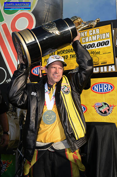 DEL WORSHAM: Really what I want to do is drive that Toyota Camry with the No. 1 on it. In 2011 when I quit at the end of the year, I didn't get a chance the next season to drive the car with the No. 1 on the side of it, so next year I'm going to go out and enjoy that and know that we were the World Champions and try and win a second one. When I was growing up, the greats, Don Prudhomme, Kenny Bernstein's the Frank Holly's, and Raymond Beadle, the won multiples, you know, so hopefully we can try and back up what we did this year and maybe we can do it a little bit better before the count down, so it's not a surprise. Q. When you were the crew chief for Alexis DeJoria, did you learn anything, bring anything back to the seat of the car that helped you focus on this championship? DEL WORSHAM: Yeah, I think I did. It's not big things, it's just little things, like when you're backing up from the burn out, you try and pay attention getting the car lined up. You don't want to make a whole lot of moves once you get behind the starting line, get tired of watering like that, so I maybe I got complacent through the years backing up fast and not paying attention as much as I should have, being behind and helping Alexis and working with her, I rethought and refocused on some of those things. Also the importance of just every run. If you lose a run somewhere during the weekend, that could have been the run that could have qualified you, or positioned you or had something to do with it. Really focus and pay attention and make sure we get everything out of every run we possibly can.