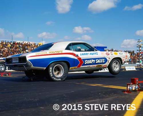 pro stock. Huff drove his Mopar at NHRA, AHRA and IHRA events and won his fair share. Retiring from the driver's seat in the late seventies Huff returned for some driving fun in the retro Pure Hell AA/FA in 1991. Old friend Rich Guasco provided Huff's "comeback" into racing via the Hot Rod Reunions.