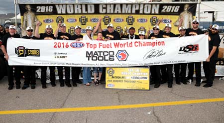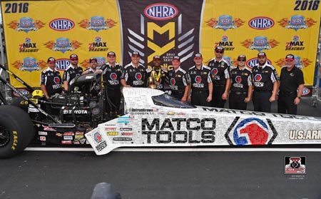 ANTRON BROWN: That's always been the big key for me. It's always been -- that's why everybody always hears me say we, us, the Matco Tools team. You never hear me say me because it's not me. I'm just the last one that gets to step on the pedal. I'm just the one that gets to tear it all up or blow it up or turn the win light on at the end. That's it. The guys never get the credit that they're due, and I'm glad that you mentioned our team, because that's one thing that we need to exploit more, each guy and what they do. They work so hard, not just at the racetrack. That's just what they do week in and week out at the racetrack. But even all the hard work that goes back on in the race shop, preparing, making sure everything is flawless, there's not a crack in the chassis, from the engines being put together to precision and perfection, and the cylinder head guy making the cylinder heads right, the clutch guy making every part of the clutch is perfect, from the discs being straightened to the levers being right, the blower guy making sure the blower makes the boost the same way every time, the tire guy, rear end guy making sure nothing goes wrong, because not just for us to perform, but they've got my life in their hands. And then our crew chief, making sure that every management and keeping all the guys working in unison together, and then you've got our two crew chiefs who orchestrate the strategy and the planning to make it all happen and work. It's just so much that has to happen, and to have a team come together and do what we have done is just -- that's why I tell them I'm always blessed to drive this car because I'm fortunate to be on a team that has this much talent and is truly just an all-star cast of a group and is going to go as being one of the best teams in NHRA history, I can tell you that for sure. Q. Don Schumacher has put together a whole bunch of those teams -- ANTRON BROWN: And Don knows the magic formula for sure, trust me. He knows it takes not good people but great people, because if you want good, good doesn't get it cut in NHRA Drag Racing because there's no do-overs, there's no mulligans, you don't get second chances. Your second chance is when you go to the next race and you have a chance to redeem yourself to get back in the game. And from the Army team with Mike Green to Jimmy Prock with Infinite Hero team, Tobler with the NAPA team, JC the crew chief, Todd, Phil, all of our crew chief list goes on and on and on that we have some exceptional star talented crew chiefs. All these crew chiefs have won championships here pretty much, every single one of them, or has been on a team that's has won a championship if they're running a car now, and when you look at all of them, you're like, man, you look at it, this is kind of like, if you ever want to go to like -- you go to an All-Star team, like you have the All-Star Game at the end of the year like in the NBA or you have the Pro Bowl for NFL, well, we have the Pro Bowl sitting right here at Don Schumacher Racing. We have the best of the best, and our team takes each other out because they're going against each other for the championship, and you've got Force and all them out there, Lucas' and Torrences and Kalittas, but when you come to DSR, we have truly an all-star cast all the way around, and Don knows what it takes to win championships. That's why he's such a successful businessman. He brought that same work ethic and know-how and collaboration to his race teams.