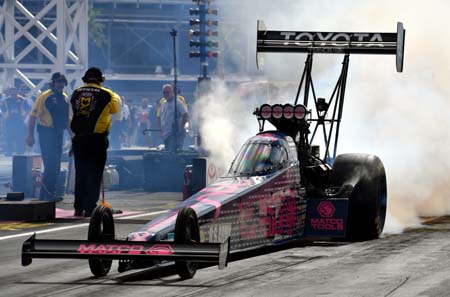 ANTRON BROWN: It's that everything is left on the line, and the pressure is at an all-time high. We know the stakes are intense that we're going after and that you can't mess up. Like if you go in No. 1, you can mess up one race and you have to rebound fast, and we know that going in that, you know what, we go in there with that even mindset that, all right, this is for all the marbles; six races decides everything, and there's 24 rounds up for grabs. Let's go out here and grab as many as we can. It's survival of the fittest, and we're going after every nook and cranny, and we take it hard and we take it seriously. Q. You described it so well here; one of my questions was even though you have the championship in your pocket again, how intensely were you going to race here at Pomona coming up? And what changes may you make in the team or in the car? ANTRON BROWN: Well, when we come to Pomona, I can tell you one thing, that when we race at certain races, we race strategy. We race the racetrack, and I'd be lying to you, you look at your competitors and you try and look and see what you need to run to win that round. That gives you the best percentage value to win that round. That's what everybody does in statistics, and we go in there and we go, all right, we need to run this. Well, Pomona, the cool part is that we're going to go out there and we're going to run hard, and the good part is we have nothing to lose, and we can go out there and we can try to rotate the earth, we just hope the earth goes with us so we can actually make some world record setting runs and have some fun with it, and then on race day, we're going to race to win. We're going to push a little harder than we normally push, but we're going to push because you have to now to win a round of racing, whoever you race, because all these cars are running so good. Everybody, every team out there is capable of breaking a world record at any given time if the conditions yield it. So you have to go out there and run and make those runs if you -- I mean, if you're trying to win that round, you have to go out there and give it your best shot so you can go there and have a shot at winning the race. Well, when you have a shot, you can make it to the finals, but to get there, you have to get through some serious competition.