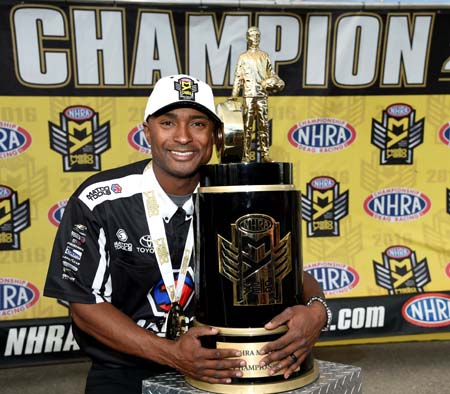 We're currently joined by Antron Brown, driver of the Matco Tools Top Fuel dragster. Antron clinched his third and second consecutive Top Fuel World Championship last weekend at the event in Las Vegas. He raced to seven victories in 11 final rounds this year. Antron, thanks for calling. ANTRON BROWN: Any time. Any time. Q. You're the world champ once again. How does it feel? ANTRON BROWN: Oh, it feels great. It feels great. It'll never get old. This is what we all work so hard for. We had a really good season, and the Countdown, again, was good to us because unfortunately we messed up in St. Louis, and it set us back, but we were able to rebound and use that after St. Louis, adjusted after St. Louis, rebounded and came out the next three races with our head down, qualified well. That's what really set the tone, and I think that's what our team with Brian and Mark and all of our Matco Tools boys did well is that we adapted to the situation where we just kept working hard at it, where we said, you know what, to put ourselves in a better situation we need to qualify better, and that's what we set out to accomplish, and we achieved that. We've qualified in the top-five every race since then, and it really set us up for race day to go rounds, and that was the main thing, going rounds, getting lane choice, and coming off, peeling off with a few race wins there, and it really helped us clinch that championship again this year.