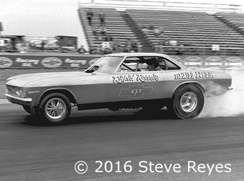 One of the coolest early Corvair funny cars belonged to Rapid Ronnie Runyan. His Blue Hell Corvair was a fan favorite wherever it raced. Ronnie and brother Mike were one of the first of the California funny cars to tour nationwide. When Ronnie was feeling bad or tired from touring, brother Mike donned Ronnie's fire suit and drove. In fact Mike was asked by Harry Schmidt to drive his new (not yet) Blue Max Ford Mustang. However, Mike had promised his dad he would return from touring and finish school.
