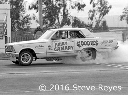 One of those wild and wacky NorCal based Goodies sponsored funny cars was the Hammons, Williamson and Hammons Hairy Canary. The car debuted in early 1967 with Rich Hammons trying to get down the quarter-mile in the ill-handling Valiant. It was a Kodak moment every pass it made.