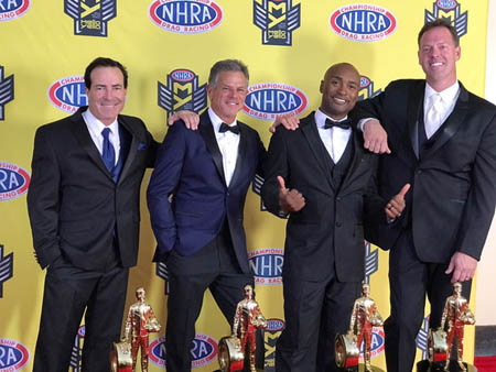 The four drivers were honored for their season-long achievements and presented with checks and trophies for winning 2016 NHRA Mello Yello Drag Racing Series world championship titles during the NHRA Mello Yello Countdown to the Championship, NHRA's playoffs. Brown celebrated earning his third Top Fuel world championship. He secured the crown at the penultimate race of the season in Las Vegas over Halloween weekend. The driver of the Matco Tools dragster raced to a category-best seven victories, including three playoff wins in the Countdown to the Championship. He is the only African-American driver to win a major U.S. auto racing season championship and it is the first time in seven years that a Top Fuel champion has won back-to-back titles. Capps secured his first Funny Car world championship Saturday at the Auto Club NHRA Finals. Capps started his quest for the world championship with a win at the season opening event in Pomona when he defeated 2015 champion Del Worsham. Capps, driver of the NAPA Auto Parts Dodge Charger R/T, and his team were a dominate force all season with five race victories, five runner-up finishes and seven semifinal round appearances. Capps held the points lead for 17 events during the season, including the last 14 consecutive races. Line became a three-time Pro Stock world champion at the Auto Club NHRA Finals on Sunday. The driver of the Summit Racing Equipment Chevrolet Camaro concluded the season with eight victories in addition to six runner-up finishes and seven semifinal appearances. He was the No. 1 qualifier at seven events throughout the year. Line and teammate Greg Anderson combined to win the first 13 events of the 2016 season and never conceded the points lead to another team. Line led the points for the final nine races and a total of 22 events. Savoie captured his first Pro Stock Motorcycle world title Sunday at the Auto Club NHRA Finals. The rider of the White Alligator Racing Suzuki had two victories this season, finished runner-up four times, including two consecutive at Atlanta and Englishtown, N.J., and secured the No. 1 qualifying position at the final three races.
